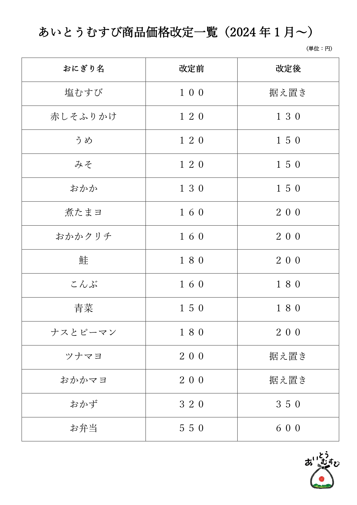あいとうむすび商品価格改定のお知らせ(2024年1月~)