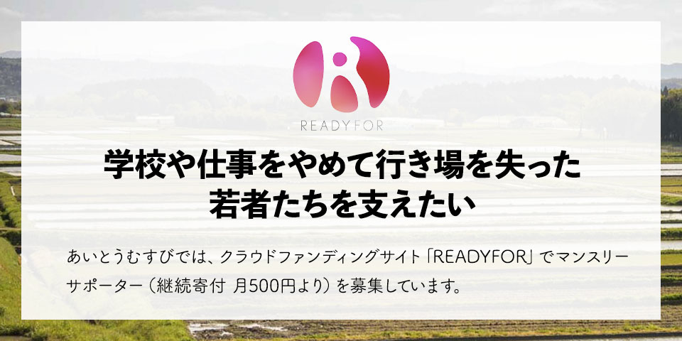仕事や学校をやめたとき、行き場を失う若者がいます。自分だけがダメなのだと責め、自信をなくしている人もいます。あいとうむすびは、そうした若者たちが参加するおにぎり屋です。新商品の試作から、握り方、販売まで、意見を出し合いながら働きます。仕事を通じて仲間と出会い、働くことを学びながら、人と一緒に安心して働ける自分に出会う場所です。就職だけを目指す場所ではなく、不安定な働き方が増える社会のなかで、その人らしく生きるかたちを一緒に模索する取り組みです。このような取り組みは、公的な補助がとぼしいのが現状です。活動へのご理解とご支援をお願いします。